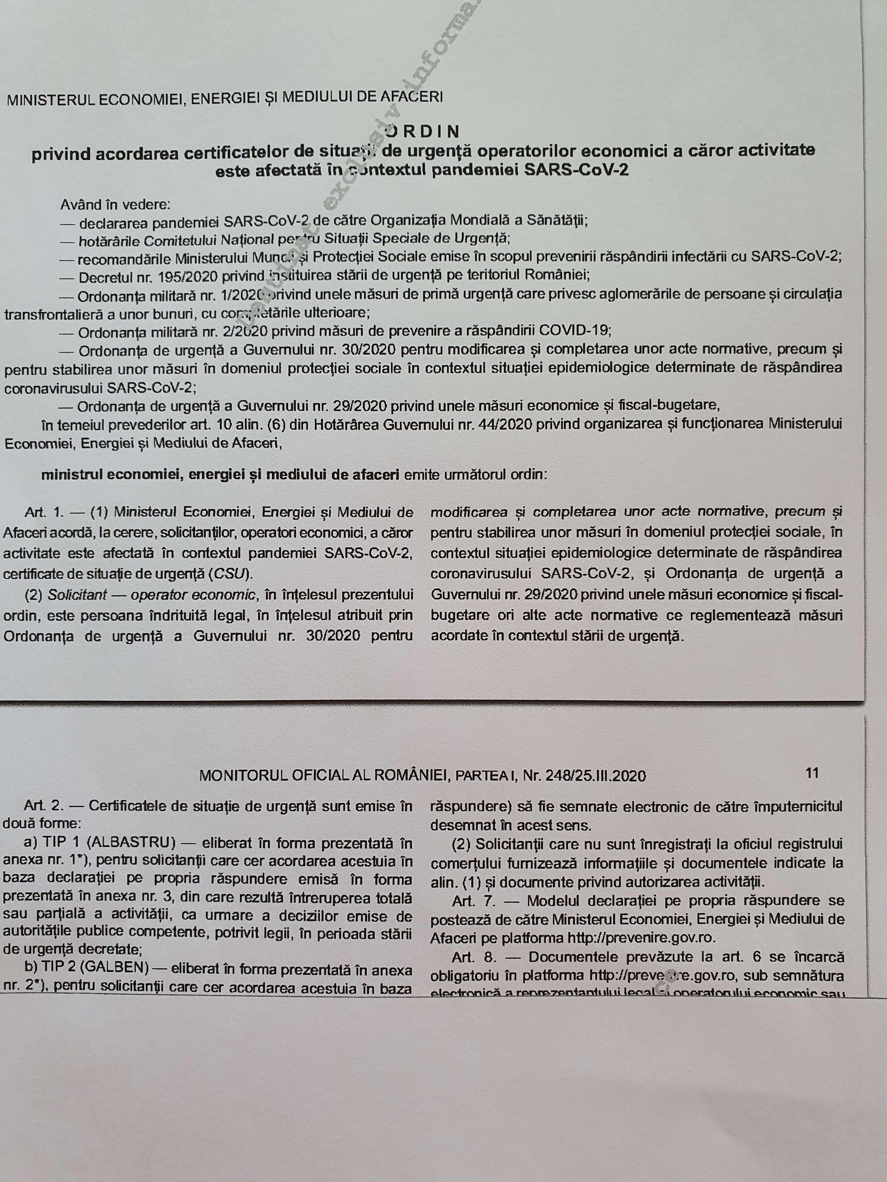 În Monitorul Oficial nr. 248/25 martie 2020 a fost publicat Ordinul nr. 791 din 24 martie 2020 privind acordarea certificatelor de situații de urgență operatorilor economici a cărăr activitate este afectată în contextul pandemiei SARS-CoV-2.