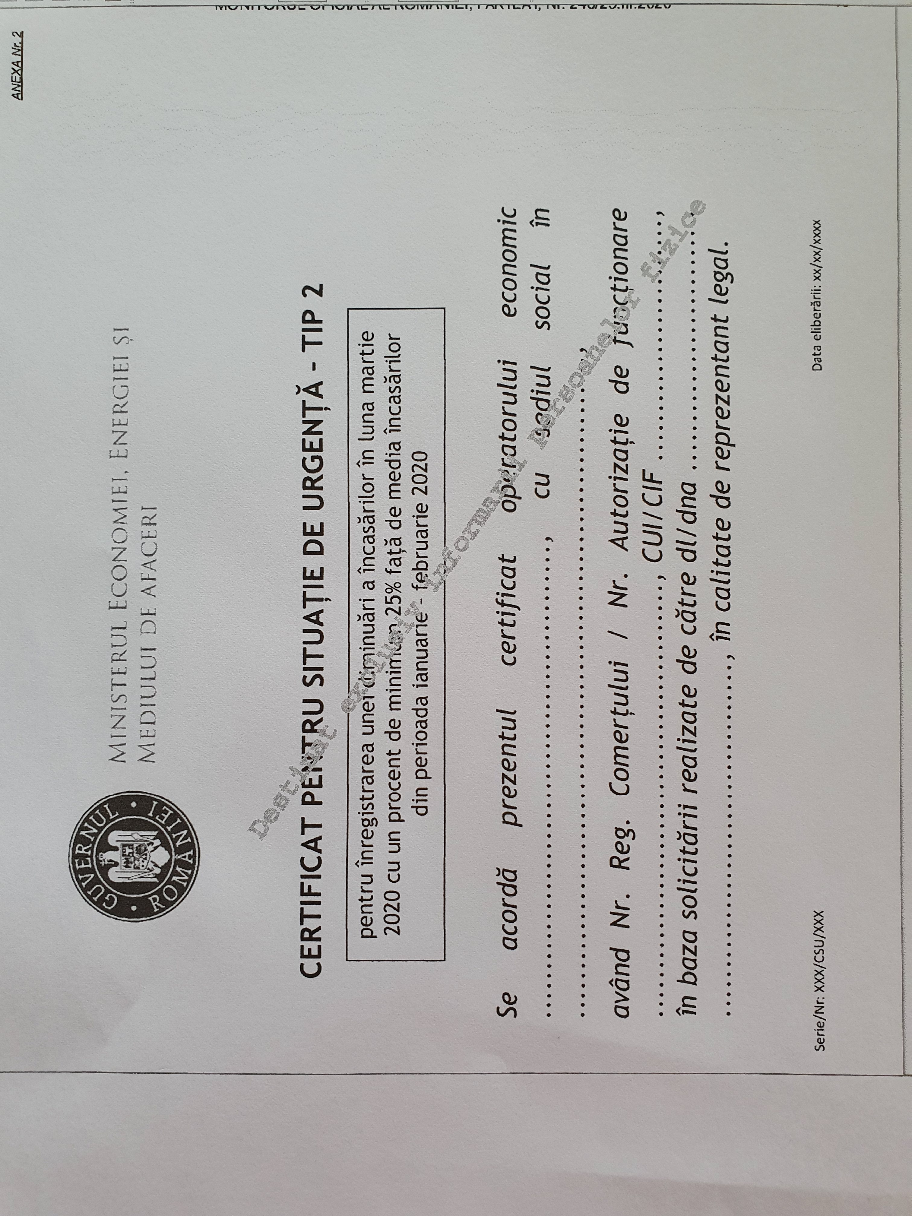 - TIP 2 (GALBEN) – eliberat in forma prezentată în Anexa nr 2, pentru solicitanții care cer acordarea acestuia în baza declarației pe proprie răspundere emisă în forma prezentată în Anexa nr. 3 ce face parte integrantă din prezentul ordin, din care rezultă înregistrarea unei diminuări a încasărilor în luna martie 2020 cu un procent de minimum 25% față de media încasărilor din perioada ianuarie – februarie 2020.