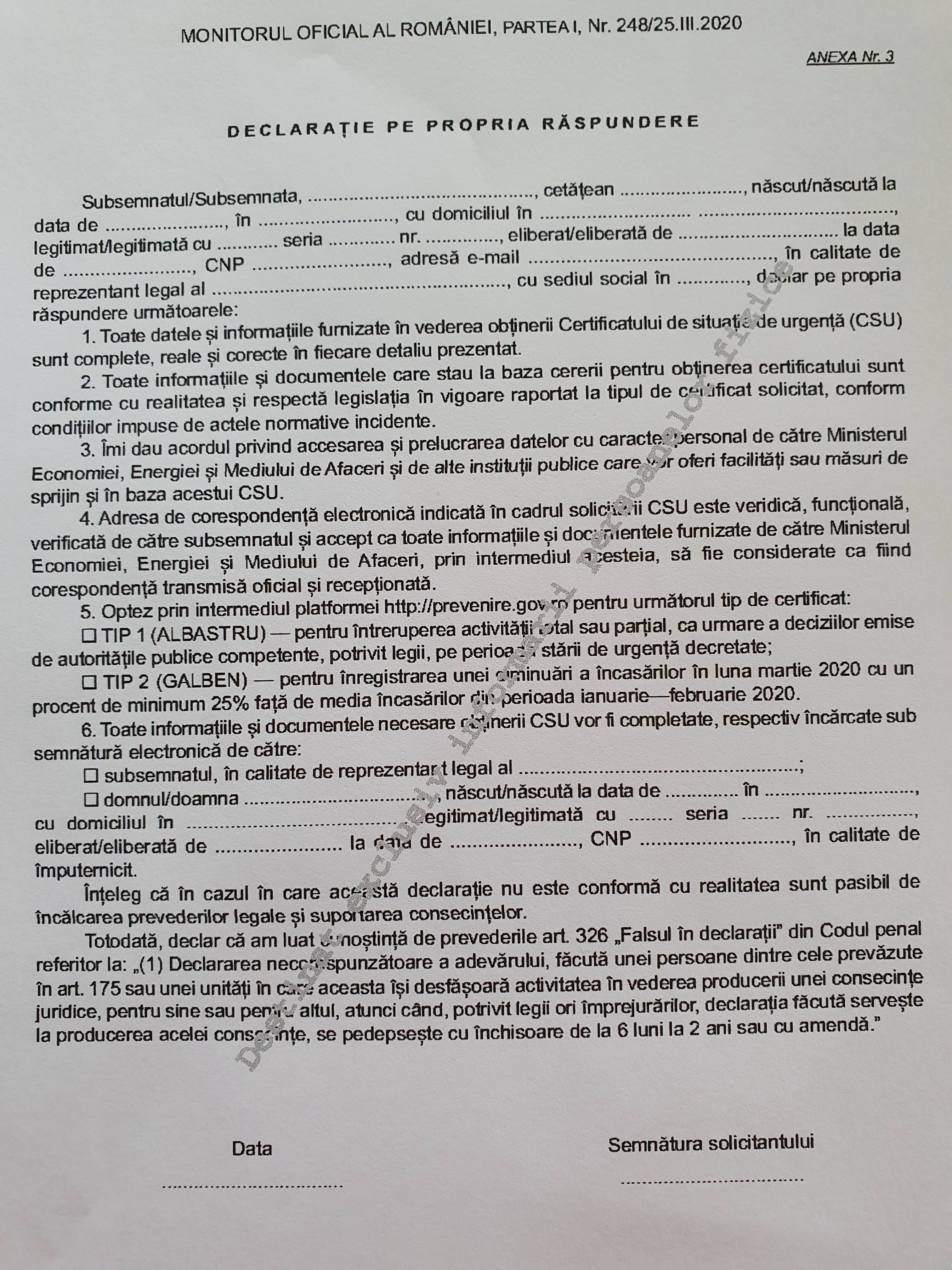 - TIP 1 (ALBASTRU) – eliberat in forma prezentată în Anexa nr 1, pentru solicitanții care cer acordarea acestuia în baza declarației pe propria răspundere emisă în forma prezentată în Anexa nr. 3, din care rezultă întreruperea totală sau parțială a activității, ca urmare a deciziilor emise de autoritățile publice competente, potrivit legii, în perioada stării de urgență decretate.